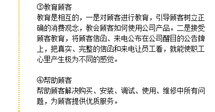 ⑤为顾客提供满意的售后服务。其中包括三包、包装、置放单据、保证安全、便于携带等。