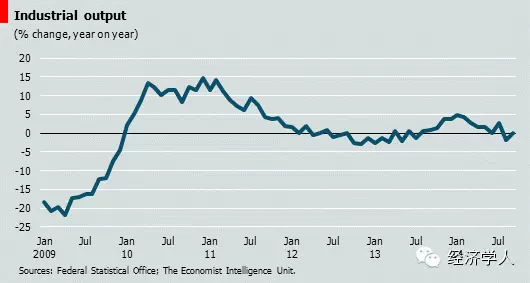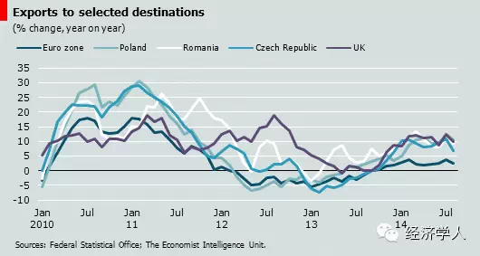 然而,拨开现象看本质,形式却不太乐观。今年前9个月,德国对欧元区其他国家的出口额仅增长了2.5%,虽然对欧盟以外国家出口的形势在很长时间以来一直是让德国保持乐观的关键理由,但是在同一时期,其出口形势非常糟糕,仅增长了1.2%。促成这种出口额的关键因素是来自非欧元区欧盟市场的需求,特别是英国、捷克共和国、波兰和罗马尼亚。今年1-8月德国对非欧元区欧盟成员国的出口额与去年同期相比上涨了10.1%。