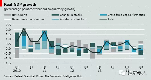 我们估计2014年GDP实际增长将为1.3%。这依赖于每季度的GDP的实际增长,而今年第四季度GDP实际增长了0.2%。我们仍然预计自2015年起,德国经济将逐步加强,但我们现在认为现在德国经济的前景不如以往明朗,并且低于我们预测。我们预计2015年经济增长将达到每季度0.3-0.4%,转化为全年增长1%,而我们之前的预测则为1.5%。预计私人消费和投资将做出主要贡献。但是,如果以这样的速度增长,两者对整个欧元区的发展也不会有什么有意义的影响。