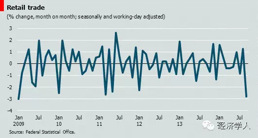 高频率的信心指标证实了这一点。德国欧洲委员会所示的9-10月德国消费者信心指数为负,而其零售业指数也下降至-7.5,达到了自2013年7月以来的最低水平。九月份零售支出月环比下降2.8%,是自2009年以来的最大跌幅。