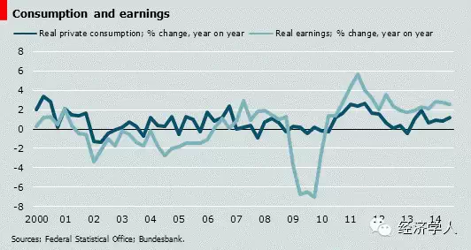 但是,到目前为止,关于发展国内经济与提高私人消费或投资之间是否相互影响的证据有限。据联德国联邦统计局(Destatis)的数据显示,2014前三季度的实际个人消费支出为德国年度总体实际GDP增长仅贡献了约0.5个百分点,根本不足以对欧元区总体产生有意义的影响。与危机前的十年不同的是(见上图),自2011年来,实质收益增长一直显著高于私人消费。