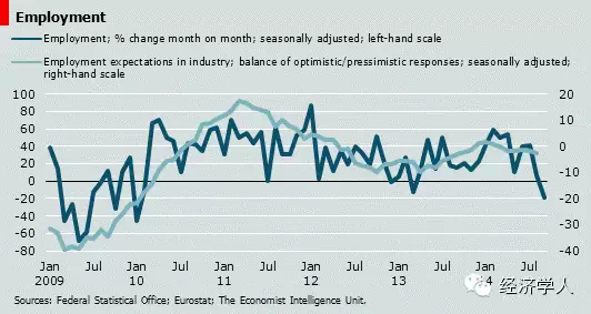 此外,就业的前景也不明朗。欧盟委员会所示的德国就业预期指数上月下跌了4.6个点,10月份跌至-6.1。德意志联邦银行(德国的央行)的数据显示,经季节性调整后的德国就业人数在9月份有所减少,这是自2013年3月以来的首次下跌。许多德国人认为,1月份引用的最低工资——每小时8.50欧元,在让一些地区的就业形式不容乐观。