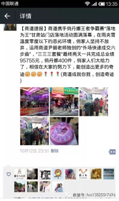 2014年10月24、25日,商道携手某品牌王者争霸赛第三季浙江站如期举行,培训后一个星期,浙江家人通过运用商道尹丽老师首创的“三三三套餐”及“外场快速成交六步曲”从以往的每天销售4件,5件,提升到现在每天销售39件,48件,59件,63件,76件,最高98件!让连单不再只是梦 想!